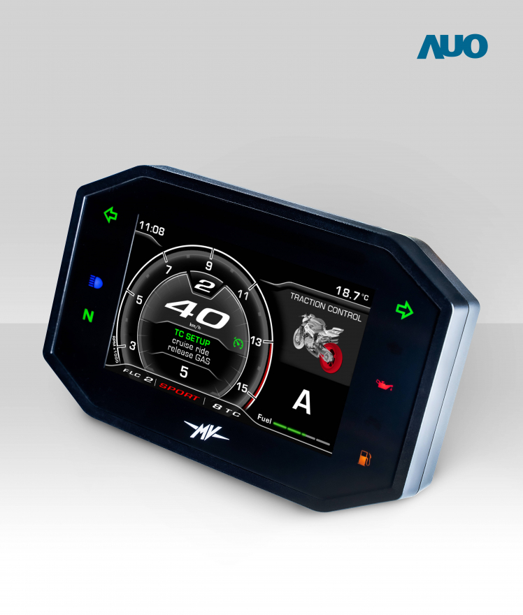 AUO smart dashboard system for motorbike is equipped with AUO automotive panels and builds the key communication interface connecting human, vehicle and AIoV cloud platform, as the core of realizing Smart Connected Motorcycle.