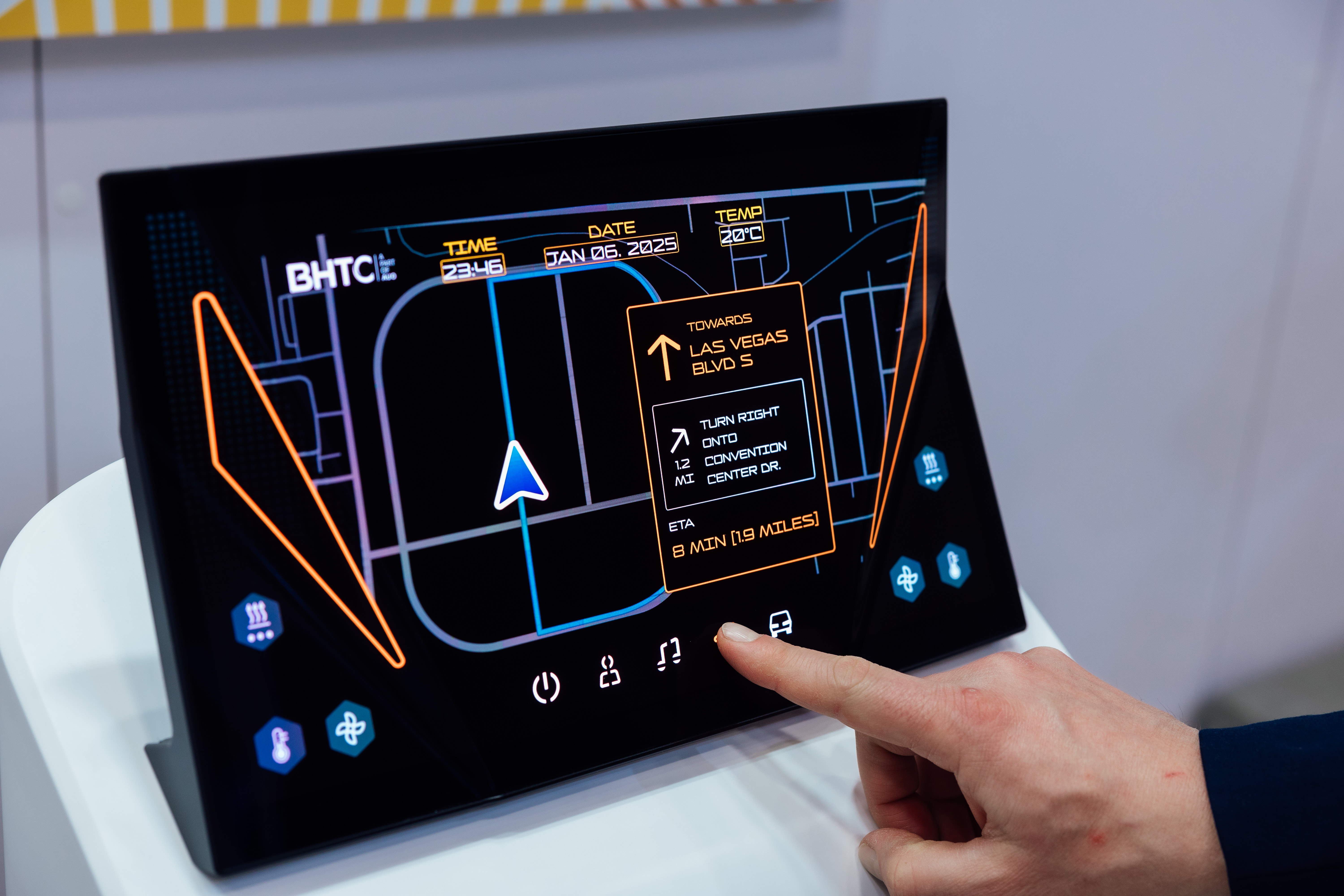Micro LED可折迭触控显示器(Haptifold Display)结合BHTC多年HMI设计经验,整合中控台和温度控制功能,以优美的曲面和独特的外型助力车内设计美学,在辅以触控回馈下,为驾驶带来更直觉的使用体验。