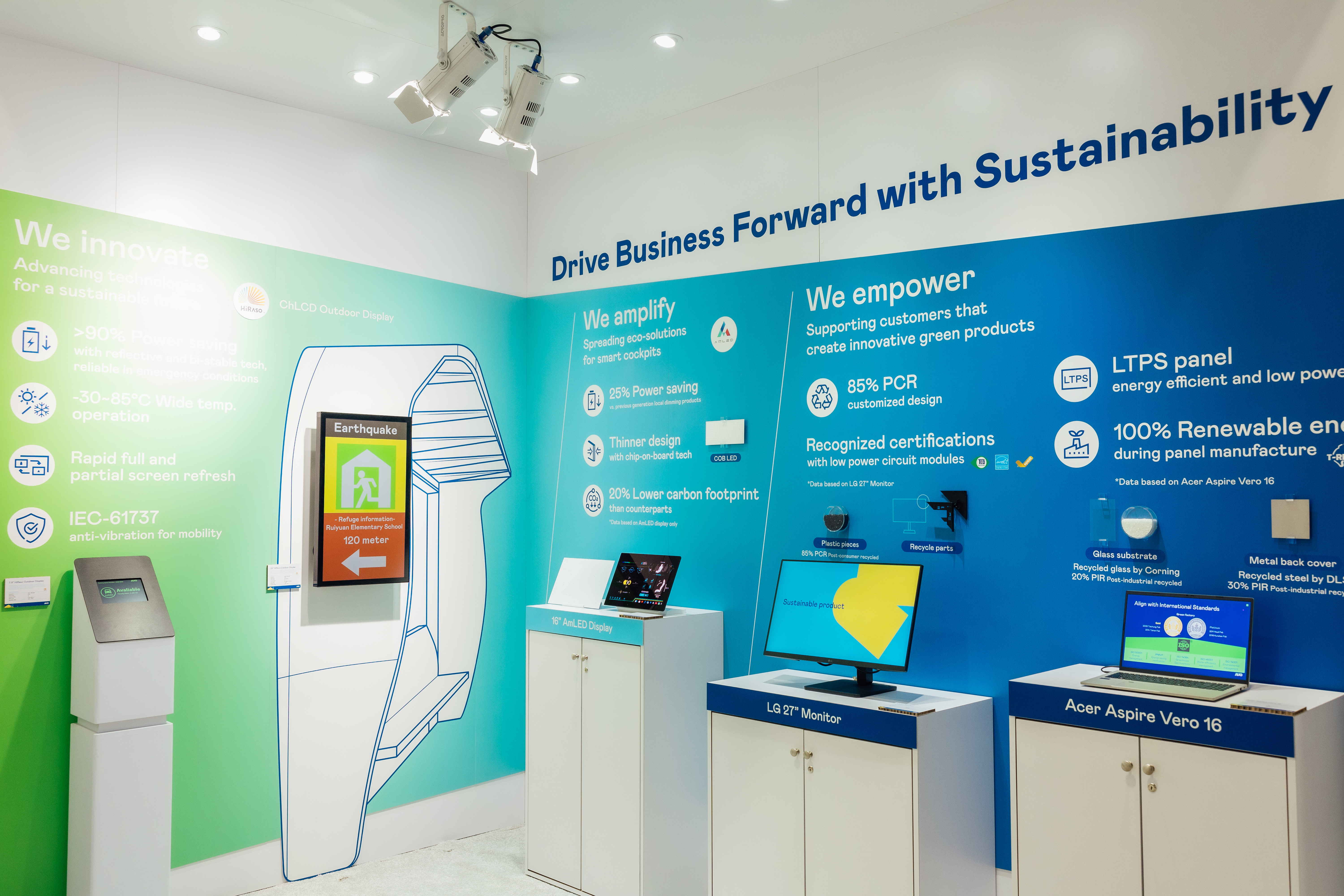 米兰·(milan)运用创新显示技术HiRaso胆固醇液晶双稳态技术达到显示零耗能、扩大节能省电的AmLED显示技术应用于车用产品、以再生的消费后回收(PCR)塑料及全绿电生产之面板,应用于笔电及萤幕,增加绿色价值。